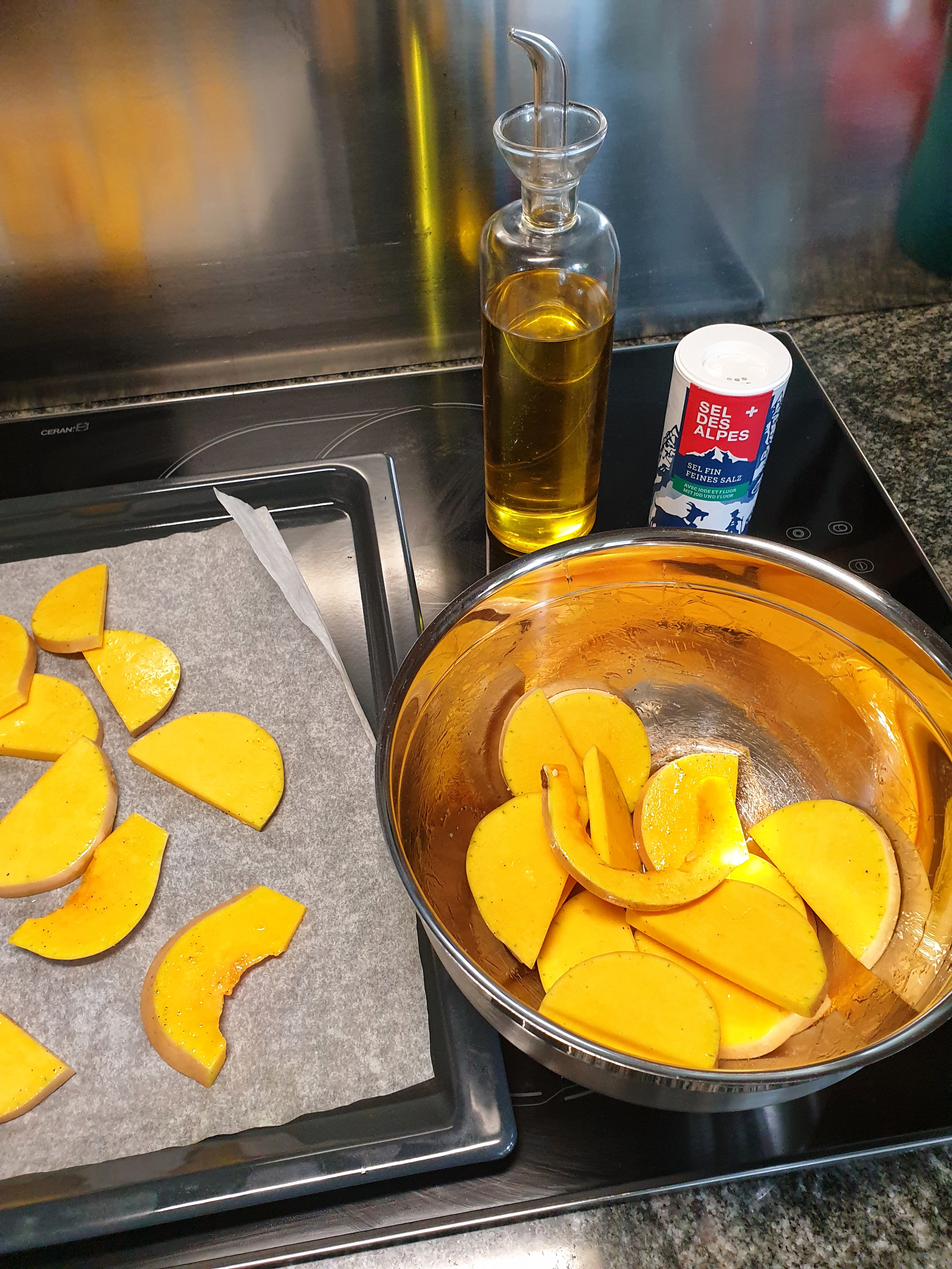 - Dans un bol, mélanger les tranches avec de l’huile d’olive, poivre et sel.