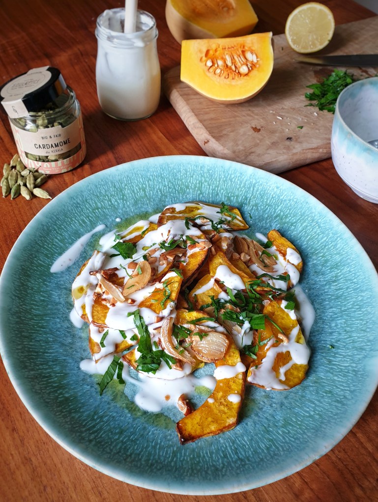 L’inspiration de cette recette m’est venue de la magnifique cuisine du Chef Yotam Ottolenghi. J’ai voulu réaliser une recette de saison avec la courge Butternut, végétarienne, pleine de fraîcheur et de saveurs. En utilisant les épices (cardamome, poivre) bio et fair des amis de SoulSpice et les noix de cajou également biologiques et fairtrade de Pakka.